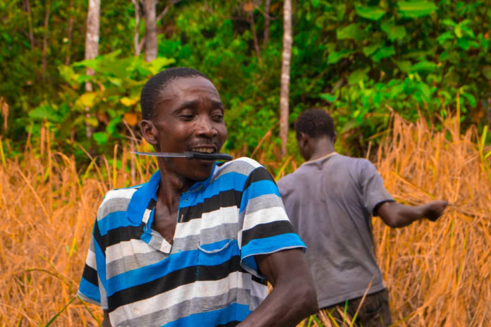 SAFS FIRST SUPPORTED COMMUNITY FARMING GROUP, NAMED YOYEMA FARMERS ASSOCIATION, AT YOYEMA VILLAGE IN KAIYAMBA CHIEFDOM, MOYAMBA DISTRICT, ON THEIR FIRST FACE OF THEIR HARVEST SEASON, ON THE 22ND OF FEBRUARY 2021.